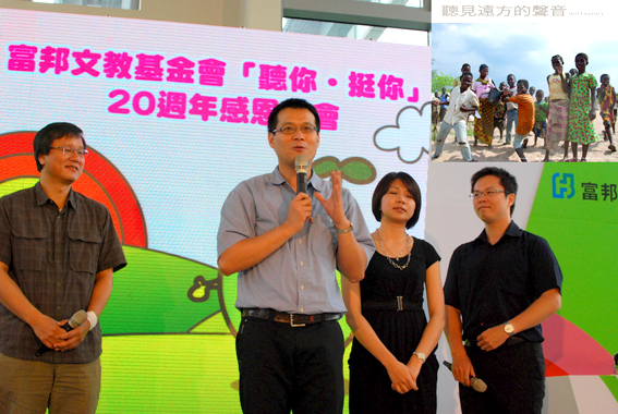 ![]() 富邦文教基金會感恩茶會特別邀請李建成老師(左2) 播放其所拍攝的「聽見遠方的聲音」莫三比克紀錄片。(照片/李老師提供) |
