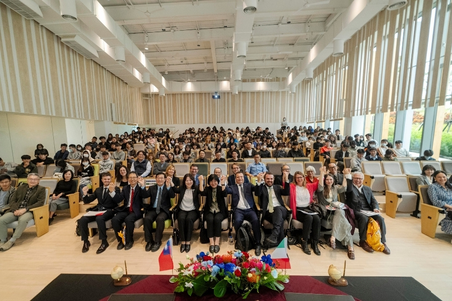 義大利杜林理工大學、坎梅里諾大學、佛羅倫斯大學、杜林大學、米蘭理工大學及義大利辦事處代表 Marco Lombardi 等貴賓,與逢甲師生合影,見證臺義設計教育交流的新里程。