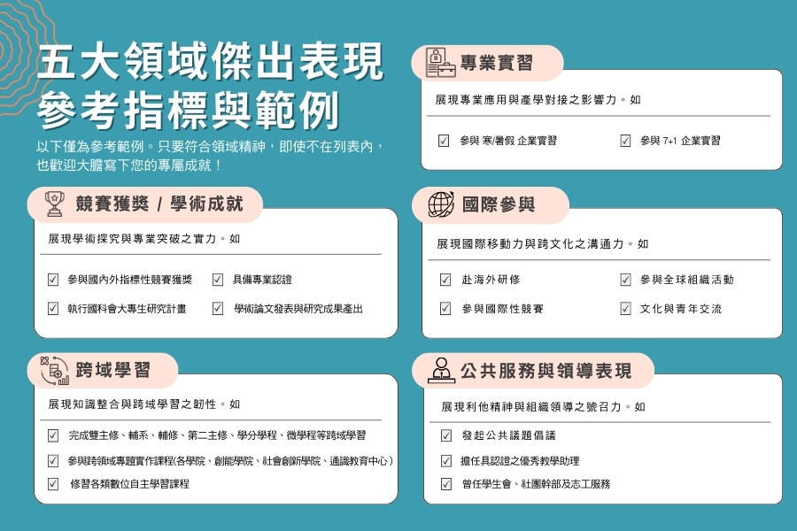 - 除前述二項基本資格條件外,申請人須於下列五大領域中,具備至少兩項不同領域之傑出表現,並需於申請時檢附相關具體佐證資料以供審核(審核範例檔案下載:逢甲大學榮譽學生申請-各領域表現自述與實蹟佐證)